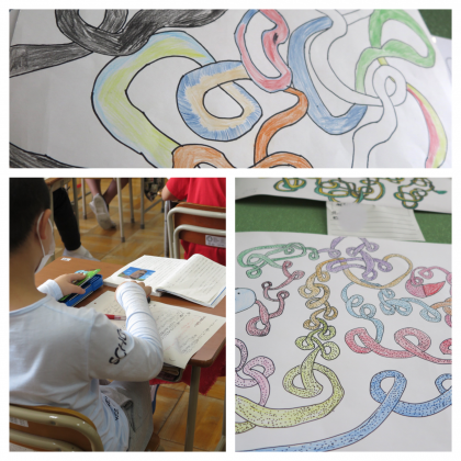 ふと、教室後ろの掲示板を見ると、そこには子どもたちの作品が掲示されていました。テーマは「カラフルへび」。年度当初には、シンプルながらも線描や色塗りの練習になる教材や、個性を表現しやすい教材に取り組むことが多いです。6年生の「カラフルへび」、オリジナリティ溢れる作品ばかりで、似たような作品が無いということが凄いと感じました。