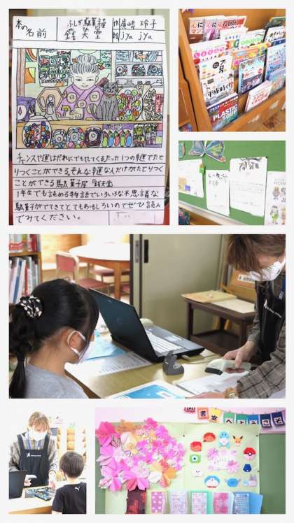 図書委員会の児童と図書館補助員さんのおかげで、本の紹介や季節の掲示などが充実し、破損した本の修理も速やかにできるようになりました。