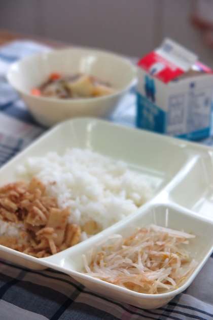 今日の献立は、【肉じゃが・もやしのゆずの香あえ・ごまかかいため・ごはん・牛乳】です。