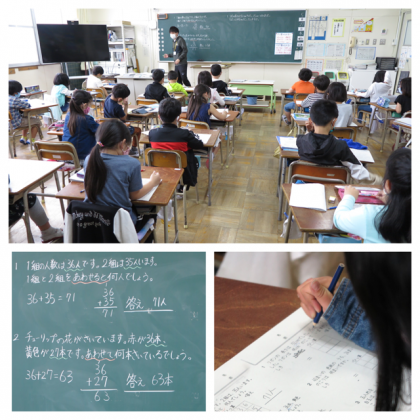 ?2年生は、算数の時間、たし算の文章問題に取り組みました。問題文の中で、「わかっていること」には青、「問われていること」には赤のアンダーラインを引いて考えます。