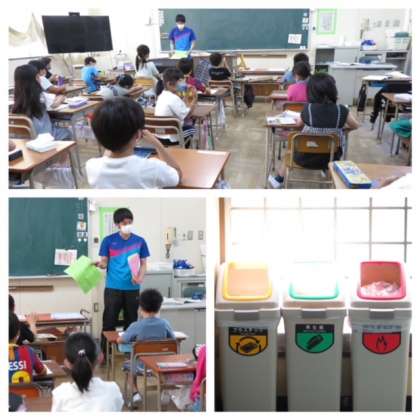 3年生は、ごみの捨て方について学習しました。それぞれのごみの定義を伝えても、子どもには判断が難しいごみがあります。各教室前の廊下には、分別回収用のごみ箱を置いています。自分たちでごみの分別ができるように、学習や生活場面の中で教えています。