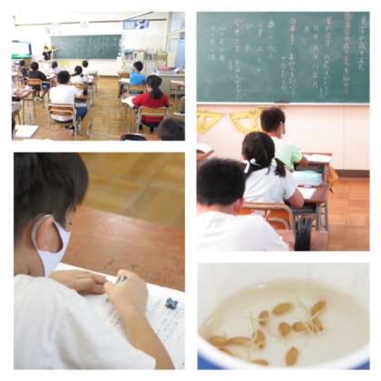 教室後ろのロッカー上には、子どもたちが育てている稲がありました。給食で提供されたヨーグルトのカップに水を張り、そこで育てています。どのカップも発芽して、稲はたくましく育っています。今は各学年植物の観察を行う学習をよく取り扱う時期ですが、植物がたくましく育つ姿は、自然に対する畏敬の念を育てることにも繋がります。