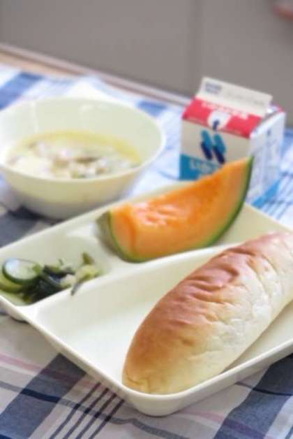 今日の献立は【かぼちゃのクリームシチュー・ミックスかいそうのサラダ・クインシーメロン・おさつパン・牛乳】です。
