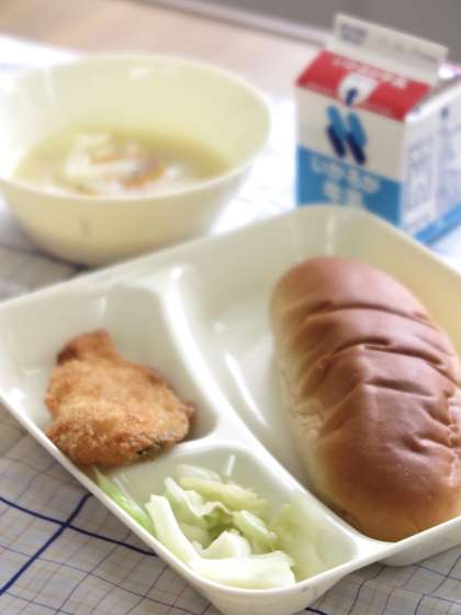 今日の献立は【サーモンフライ・豆乳スープ・キャベツのソテー・黒糖パン・牛乳】です。
