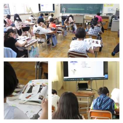 5年生は、音楽の時間にいろいろな弦楽器の特徴を学びました。バイオリン・ビオラ・チェロ・コントラバスの4種類の楽器を演奏する様子を見て、どの楽器が好きかを選びます。どうしてその楽器に惹かれたのか、理由を考える中で、それぞれの楽器の大きさが音の高さに影響しているという相関関係に辿り着きました。