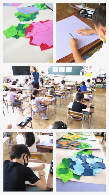 1年生は今週、図工の時間に紫陽花の作品づくりに取り組みました。今はまだ制作途中。イメージを画用紙に下書きした上に、色画用紙で紫陽花の花を咲かせます。季節に合わせたテーマを選ぶことは、図工の技術を伸ばすことはもちろん、季節感や自然への関心、豊かな感性を伸ばす面からも効果があります。