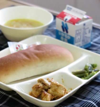 今日の献立は【鶏肉のカレーマヨネーズ焼き・てぼ豆のスープ・三度豆とコーンのサラダ・コッペパン・りんごジャム・牛乳】です。