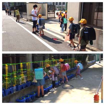 登校後は、低学年児童が水やりをしています。水やりの後、自分が育てている植物がどれくらい育っているか、しっかり観察もしています。