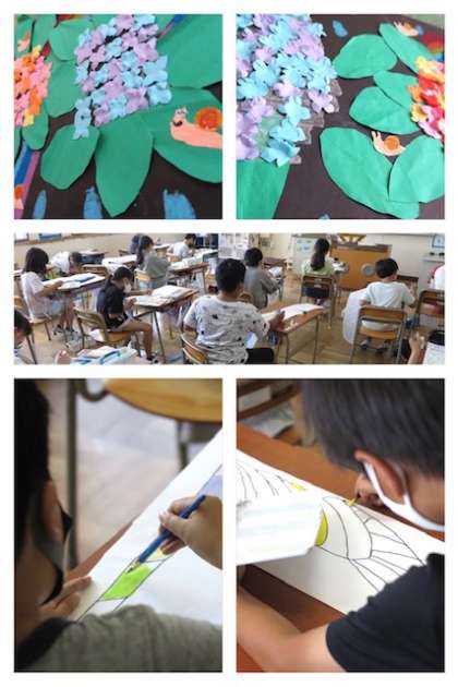 4年生は、6月に合わせて紫陽花の掲示物をつくり、次にフェルトペンと絵の具を使って傘の絵を描いています。