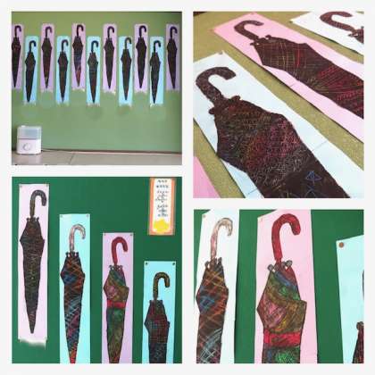 カラフルな傘の絵、これらはスクラッチアートといい、黒いスクラッチ面を削ると、下から美しい色の線が現れます。スクラッチ面は、黒いクレヨンで塗りつぶして作ります。