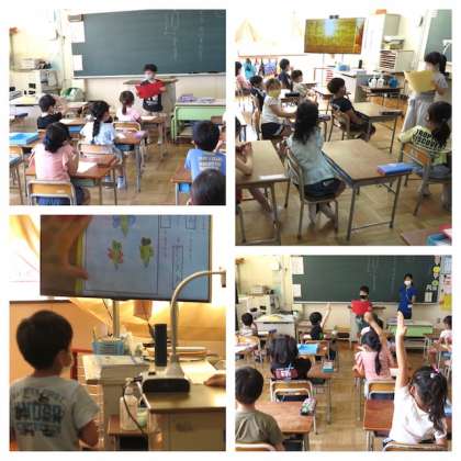 1年生は、昨日国語の時間に作った【○○は、○○で○○を見つけました。】という文章の発表をしました。