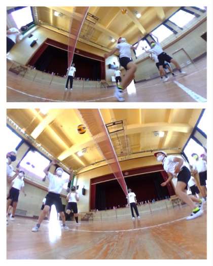 暑さが厳しくなる中、マスクを付けたままできる種目はないかを考え、全員が入り乱れることがないようネットでコートが分けられた種目ということでの導入です。