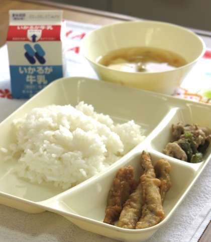 今日の献立は【いわしてんぷら・五目汁・豚肉とさんどまめのいためもの・ごはん・牛乳】です。