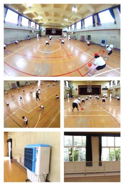 講堂は窓・通風孔を全開にし、4台ある冷風扇を運転しています。