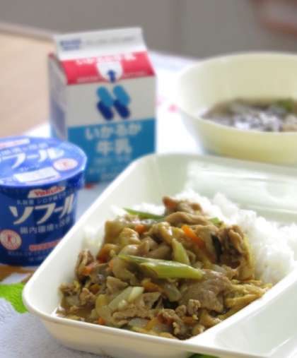 今日の献立は【和風カレー丼・もずくとオクラのとろり汁・ヨーグルト・牛乳】です。