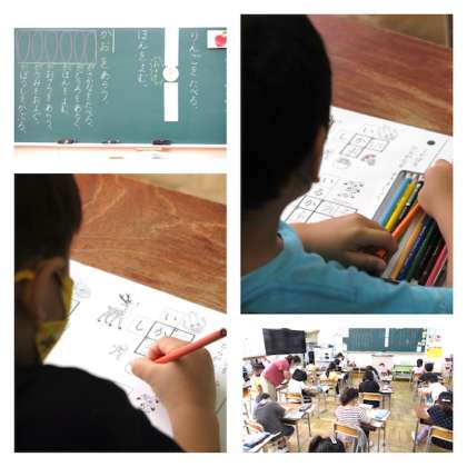 1年生は、国語の時間に「を」の使い方について学習しています。先週には「は」の使い方を学習し、「ぼくわ」とならないように「ぼくは」と書くことを学びましたが、今日の学習はその続きになります。「パンお食べる」という書き方も、小学生にはよく見られる間違いです。