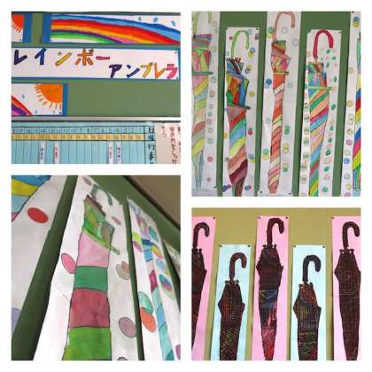 正解は、2年生のスクラッチアートの作品です。同じ「傘」をテーマに、4年生は絵の具で個性を表現しました。2年生の作品も、4年生の作品も、それぞれが「良さ」を持っていますが、相互鑑賞した際に2年生の子どもたちは4年生の絵の具の使い方の上手さに驚いていました。