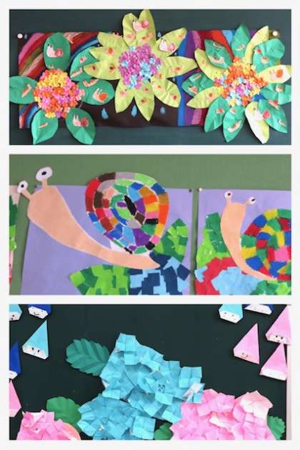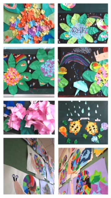 教室に目を向けても、たくさんの紫陽花の花が見頃を迎えています。子どもたちの作品です。一人一人の作品もあれば、教室の後ろを飾る作品もあり、バリエーション豊富です。中には上級生から下級生にプレゼントされた作品もあります。