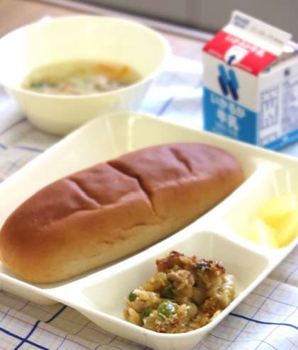 今日の献立は【カレードリア・豚肉とキャベツのスープ・りんご(カット缶)・こくとうパン・牛乳】です。