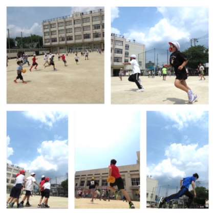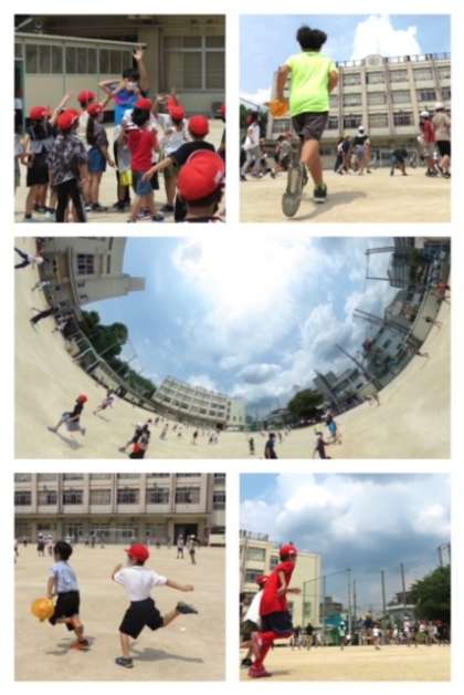 気温は27度。晴天のため、気温の数値以上に暑く感じますが、それでもたくさんの子どもたちが運動場に出てきて遊んでいます。学級全員で遊んでいるクラスも多いのか、今日は特にたくさん遊びに出てきている印象です。教職員の姿もとても多いです。