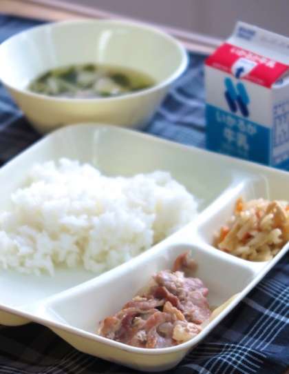 今日の献立は【豚肉の甘辛焼き・すまし汁・切り干し大根のいため煮・ごはん・牛乳】です。