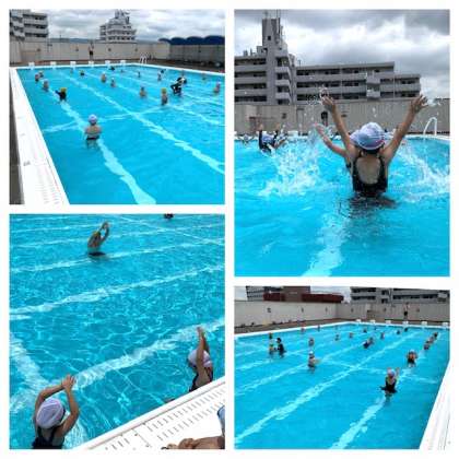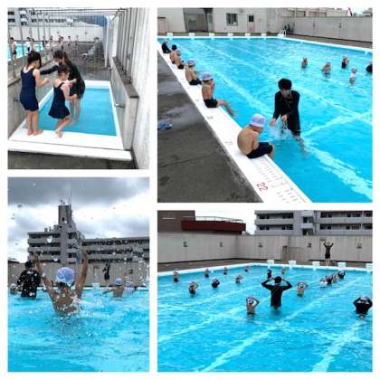 今日は初めての水泳なので、水慣れを中心に学習しました。泳ぎの前段階として、「水中に顔をつける」、「水中で目を開ける」、「体の力を抜いて浮く」といった活動をできるようにしておく必要があります。