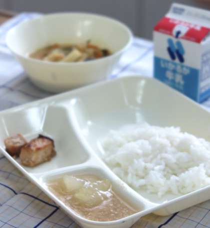 今日の献立は【さけのつけ焼き・みそ汁・とうがんの煮もの・ごはん・牛乳】です。