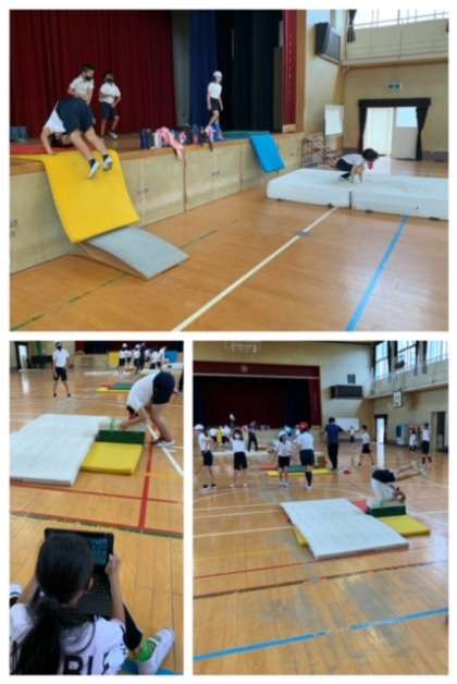 5年生は、マット運動の学習をしました。今日の学習は【台上前転】です。後から自分の台上前転の様子を視聴できるよう、見学の児童がタブレットで動画撮影をしてくれました。