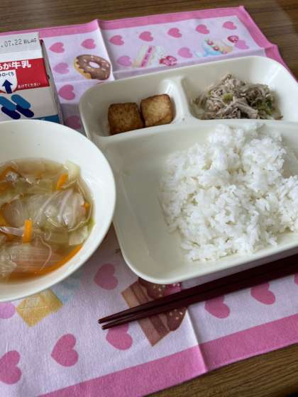 今日の献立は【ゴーヤチャンプルー・すまし汁・あつあげのしょうがじょうゆかけ・ごはん・牛乳】です。
