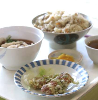 今日の昼食は【ツナ炊き込みご飯・うどん・たくあん・ちくわの磯辺揚げ】です。