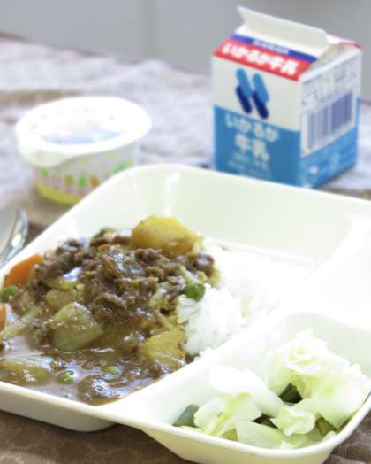 今日の献立は【ビーフカレーライス(米粉)・野菜のピクルス・ぶどうゼリー・牛乳】です。