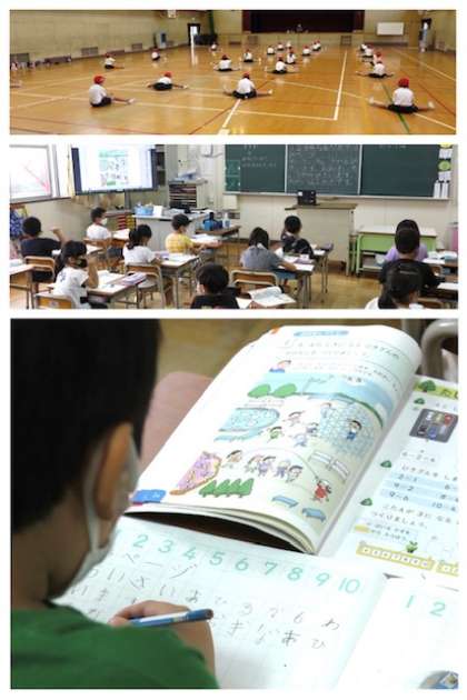 1年1組は、講堂で体育をしていました。大きく広がって、ソーシャルディスタンスを確保。柔軟体操でしっかり体を柔らかくします。コロナ禍で運動が不足しがち。柔軟体操は、ケガの防止においても効果的です。