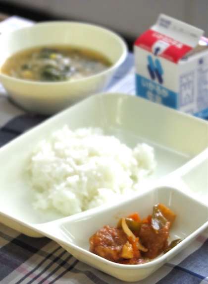 今日の給食は【酢豚・中華みそスープ・焼きのり・ごはん・牛乳】です。