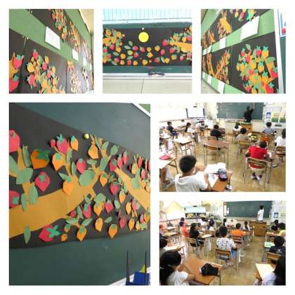 早くできた子は、他のクラスへのプレゼントも作ります。1年生の教室や音楽室にも、同じ掲示物が飾られていました。
