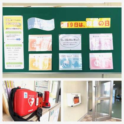 学校には、2台のAEDも設置。職員室と1階校舎入口付近に設置しています。
