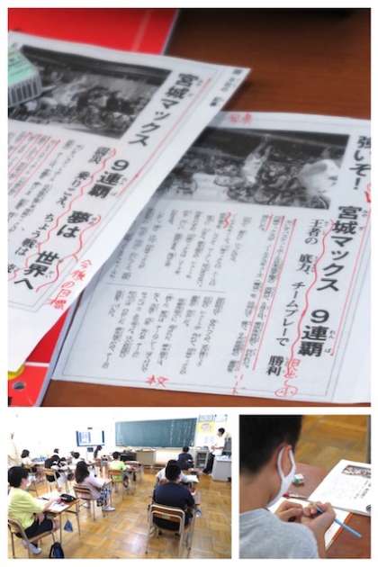 子どもの机上には複数の記事があり、その違いを比較できるようになっていました。同じ記事でも、見出しで受ける印象が異なることに気づくことができました。