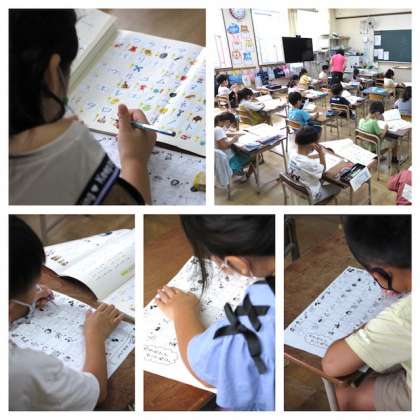 1年生は、カタカナの学習のまとめに取り組んでいました。全ての文字を1回ずつ、丁寧に練習します。