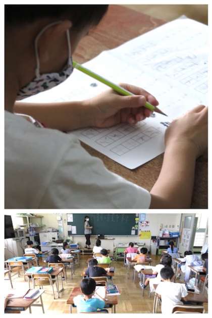 1年1組は、カタカナを使った言葉を練習しました。「ラーメン」や「パトカー」など、長音記号を使う言葉は、どこに長音記号を入れるかを間違えがち。そうした要注意ポイントを子どもたちに意識させながらカタカナの練習に取り組んでいました。