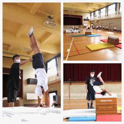 1組の器械体操は、開脚跳び・台上前転・倒立前転など、いろいろな技にチャレンジするコースを設け、子どもたちが自分で目標を決めてコースを選択していました。