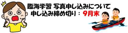 臨海学習(7月実施)の際の写真の購入期限が9月末までとなっています。まだ購入されていないご家庭で、購入を希望されている場合は、期限までにお申し込みください。