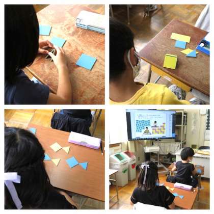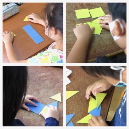 正三角形・二等辺三角形・正方形・長方形・台形・・・子どもたちはパネルを組み合わせて「家」、「魚」、「お城」・・・と、いろいろな形を作って楽しんでいました。