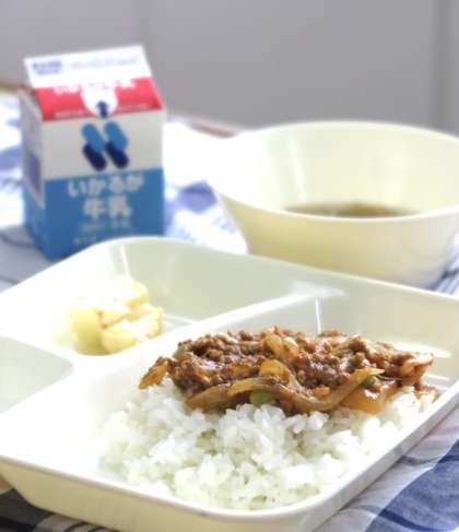今日の献立は【タコライス・もずくのスープ・焼きじゃが・牛乳】です。