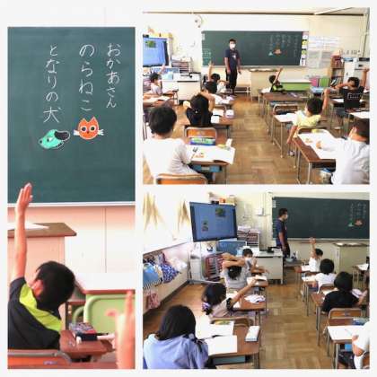 1年生は、国語の学習で「サラダでげんき」の学習をしています。先週、1組が使った動物の掲示物を使って、2組が登場人物について話し合っていました。