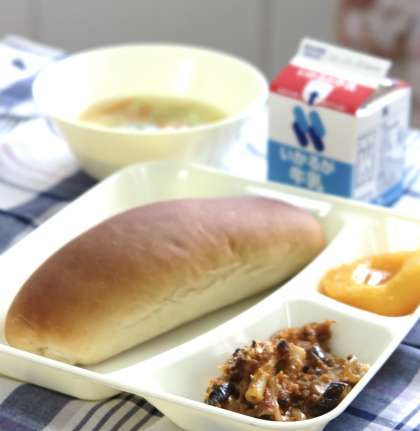 今日の献立は【なすのミートグラタン・鶏肉と野菜のスープ・黄桃(缶)・黒糖パン・牛乳】です。