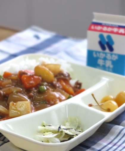 今日の献立は【ハヤシライス(米粉)・キャベツのひじきドレッシング・さくらんぼ(缶)・牛乳】です。