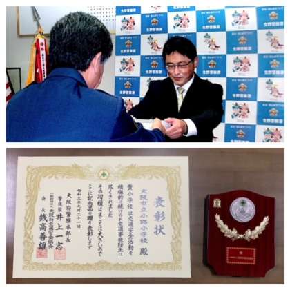小路小学校は、5年前より交通安全の作文に取り組んできました。このたび、これまでの子どもたちの取組に対し、大阪府警 本部長と交通安全協会 会長より表彰状と記念品を頂くことになりました。