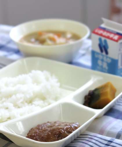 今日の献立は【和風ハンバーグ・とうふのみそ汁・かぼちゃのいとこ煮・ごはん・牛乳】です。