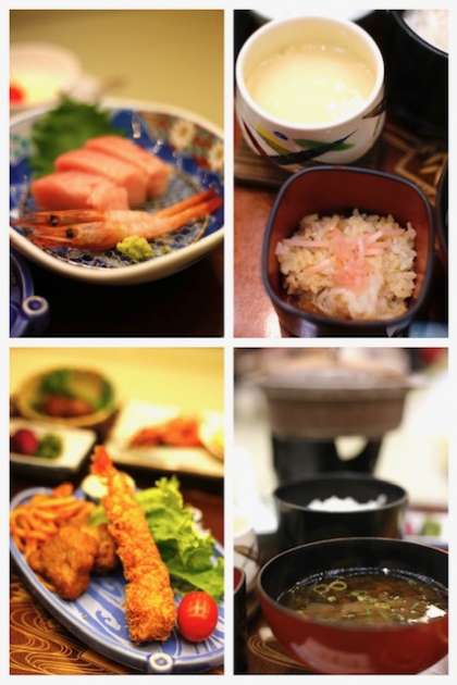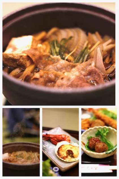 修学旅行 晩ご飯の献立は【すき焼き・肉団子・焼き海老・ホタテのマヨネーズ焼き・てこね寿司・茶碗蒸し・マグロとエビの刺身・海苔とネギの味噌汁・エビフライ・唐揚げ・スパゲッティ・サラダ・ごはん・フルーツゼリー】です。