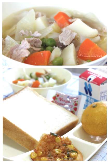 今日の献立は【豚肉と野菜のスープ煮・変わりピザ・みかん・食パン・いちごジャム・牛乳】です。