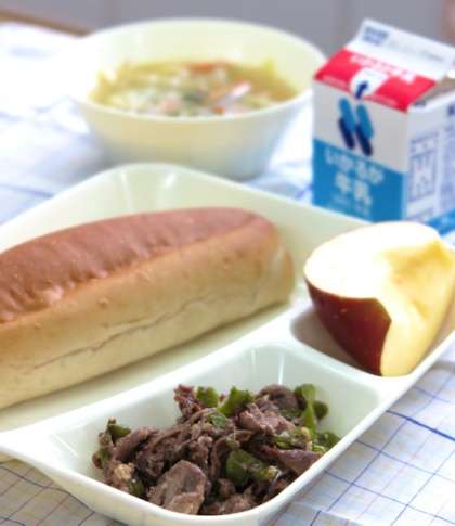 今日の献立は【牛肉のオイスターソース焼き・中華スープ・りんご・黒糖パン・牛乳】です。